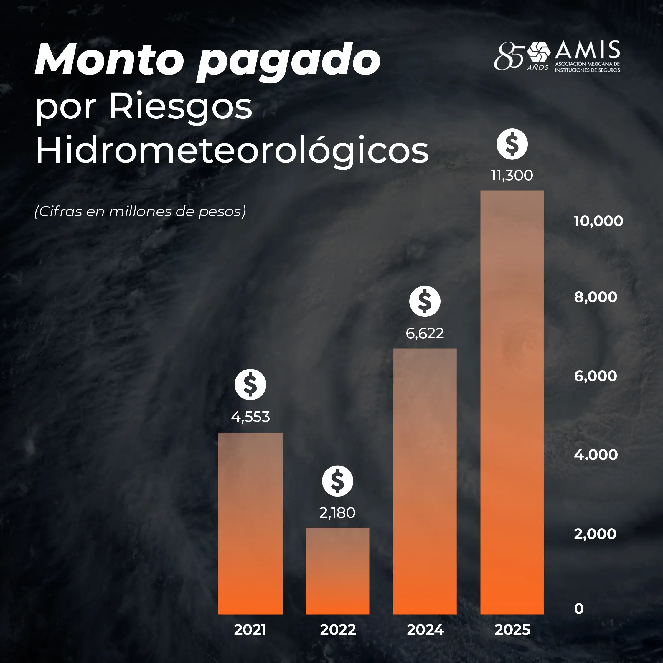 · A pesar de no haber ocurrido un huracán catastrófico, la industria estima que los daños cubiertos durante el 2025 serán cercanos a 11,300 millones de pesos para siniestros por lluvias, inundaciones y similares.